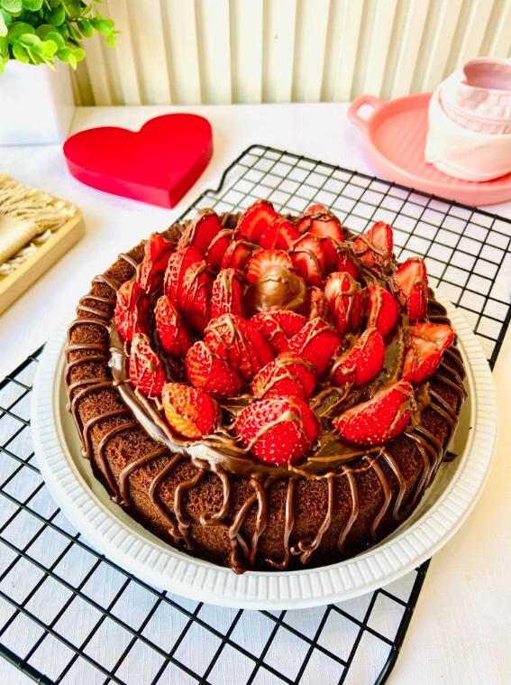 Massa de Ninho, com Cobertura de Brigadeiro Belga e decoração de morangos.