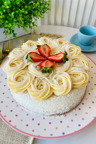 Massa de Ninho, com Cobertura de Brigadeiro Belga e decoração de morangos.