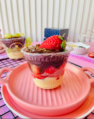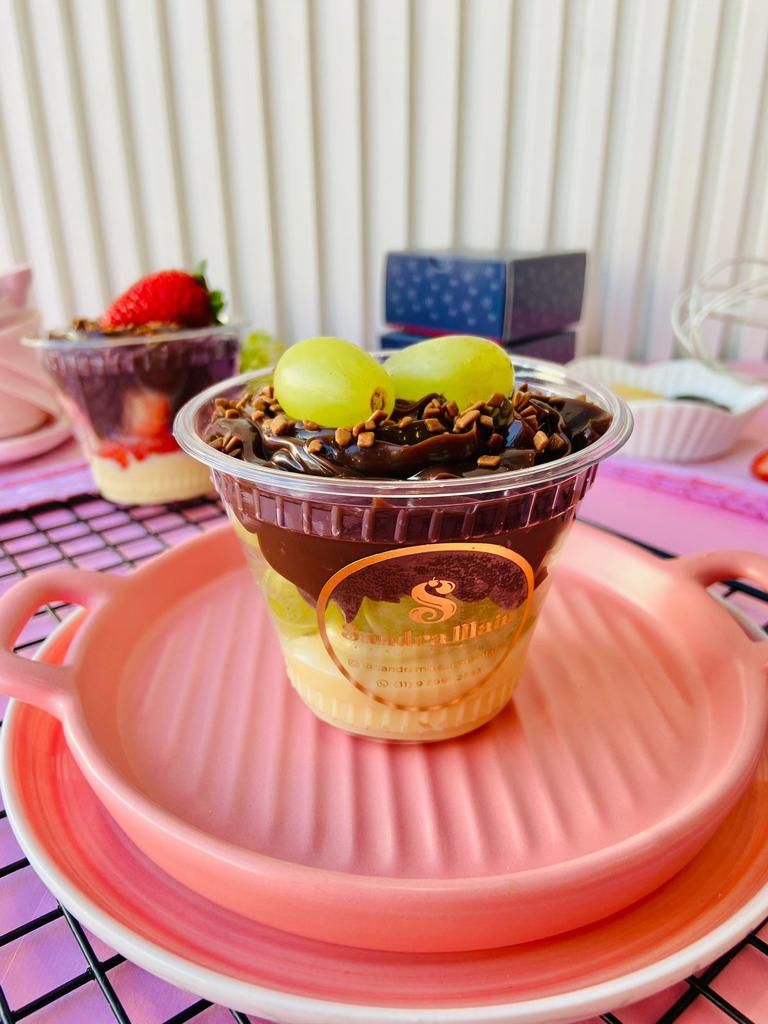 250g aproximado - Porção Individual. Bolo de Baunilha, brigadeiro branco cremoso, morangos, chantininho e suspiros.