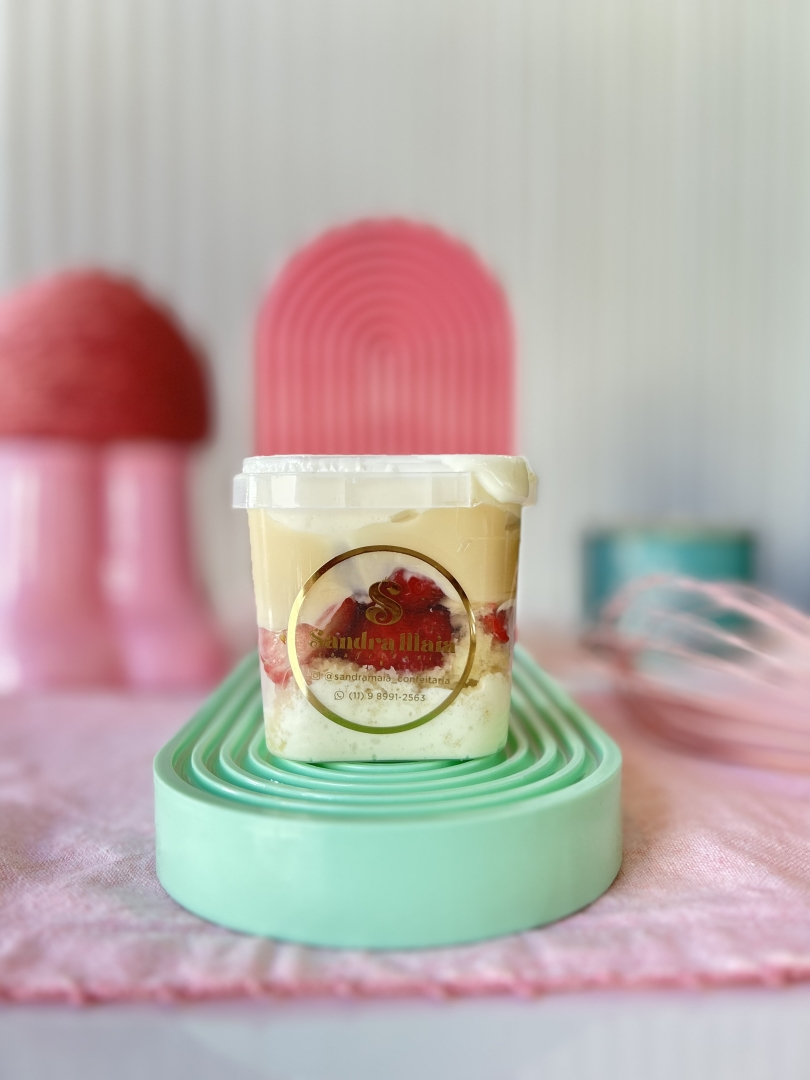 Delicioso creme nuvem com uvas verdes e brigadeiro branco, por fim o toque especial da farofinha de bolacha passatempo.