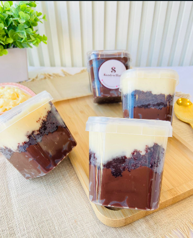 Delicioso bolo no pote, de brigadeiro de doce de leite com brigadeiro branco e massa de baunilha.
