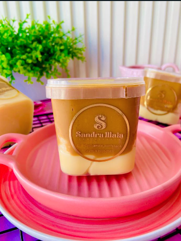 Delicioso bolo no pote, de brigadeiro de doce de leite com brigadeiro branco e massa de baunilha.