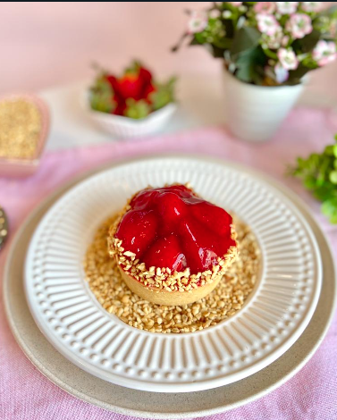 Massa Crocante, Creme de Confeiteiro, Morangos, Geleia de Morango e Amendoim.