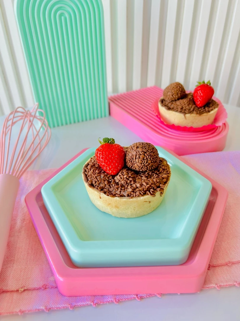Massa de chocolate Brigadeiro Belga ao Leite Brigadeiro Branco Ganache Meio Amargo Decorado com Raspas de Chocolate e Morangos picados.